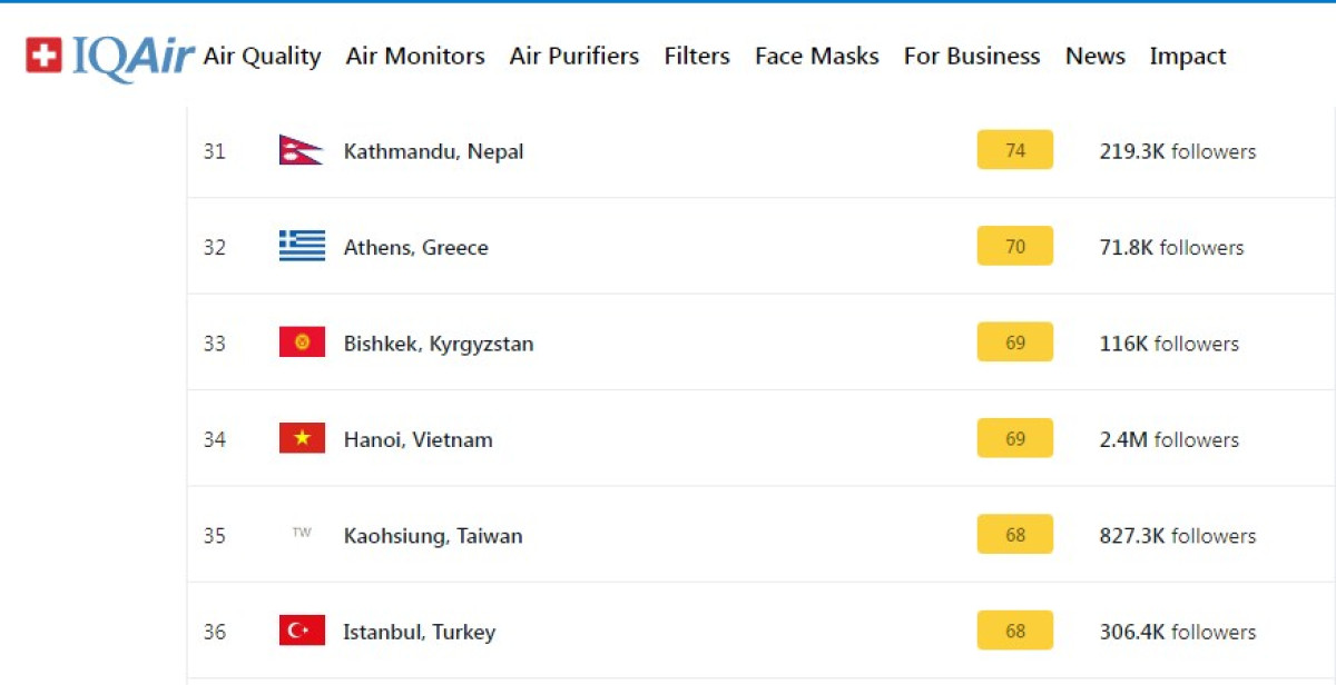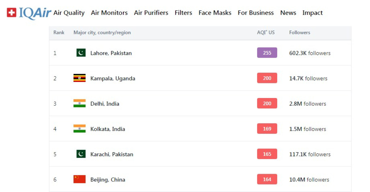 Ал эми World Air Quality уюмунун бүгүнкү билдирүүсүнө ылайык, дүйнөдөгү абасы эң булганган өлкөлөрдүн ичинен биринчи орунда Пакистан, андан кийин Уганда жана Индия турат. Кыргызстан бул тизмеде 33-орунда жайгашкан.