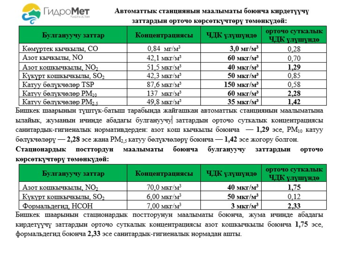 Айлана-чөйрөнүн булгануусун байкоо башкармалыгынын маалыматына ылайык, 17-октябрдан 23-октябрга чейинки мезгилде Бишкектеги атмосфералык абасындагы негизги булгануучу заттардын орточо суткалык концентрациялары чектүү деңгээлдеги концентрациядан 2,33 эсеге чейин ашкан.
