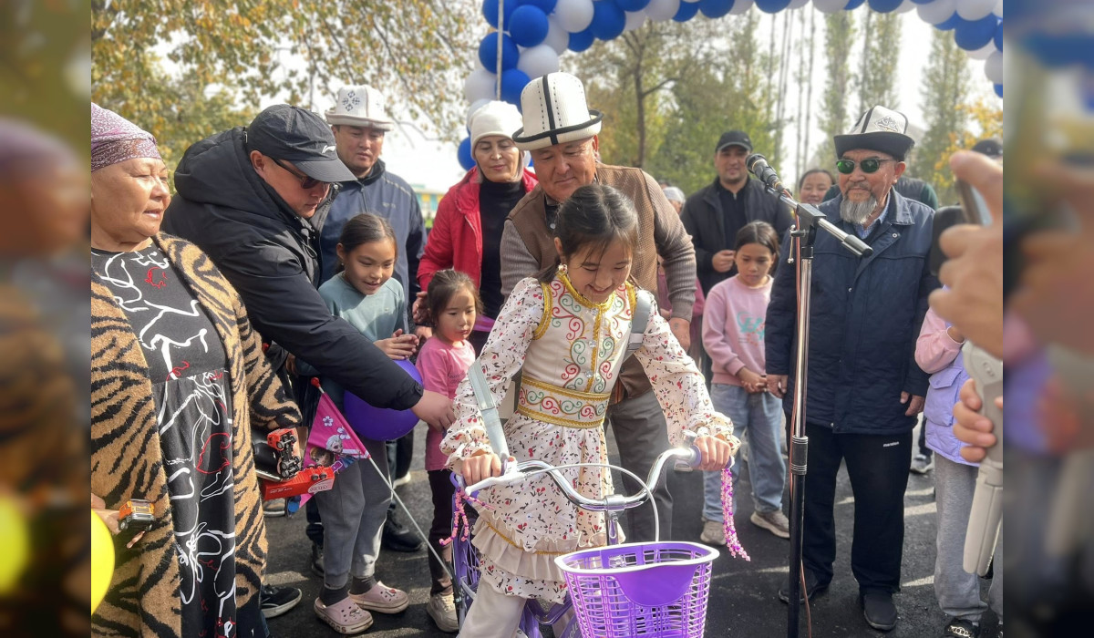 "Мэр агай, ушу биздин үйдүн короосунун алдын асфальт кылып бериңиз" деп суранган болчу. Сага белек кылып, балдар ойноочу аянтчасын да жасаттым. Ошондой эле менин атымдан дагы сага белек болсун", - деген мэр Калбүгө велосипед жана жон баштык тапшырды.