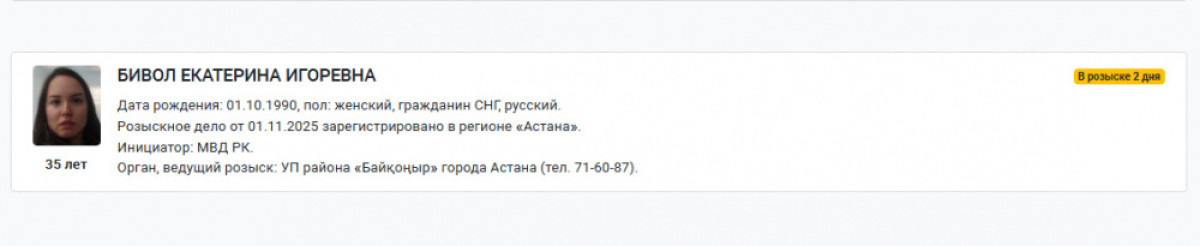 Казакстандын укуктук статистика жана атайын каттоо органдарынын порталында Екатерина Биволго издөө жарыяланды.