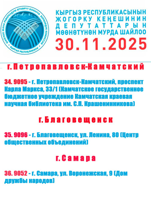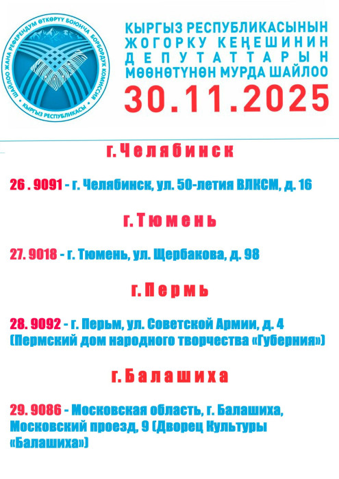 Добуш берүү күнү - 30-ноябрь, саат 08:00дөн 20:00гө чейин. Ар бир шайлоочу өзүнүн жарандык паспорту же "Түндүк" тиркемеси менен жакынкы шайлоо тилкесинде добуш бере алат.