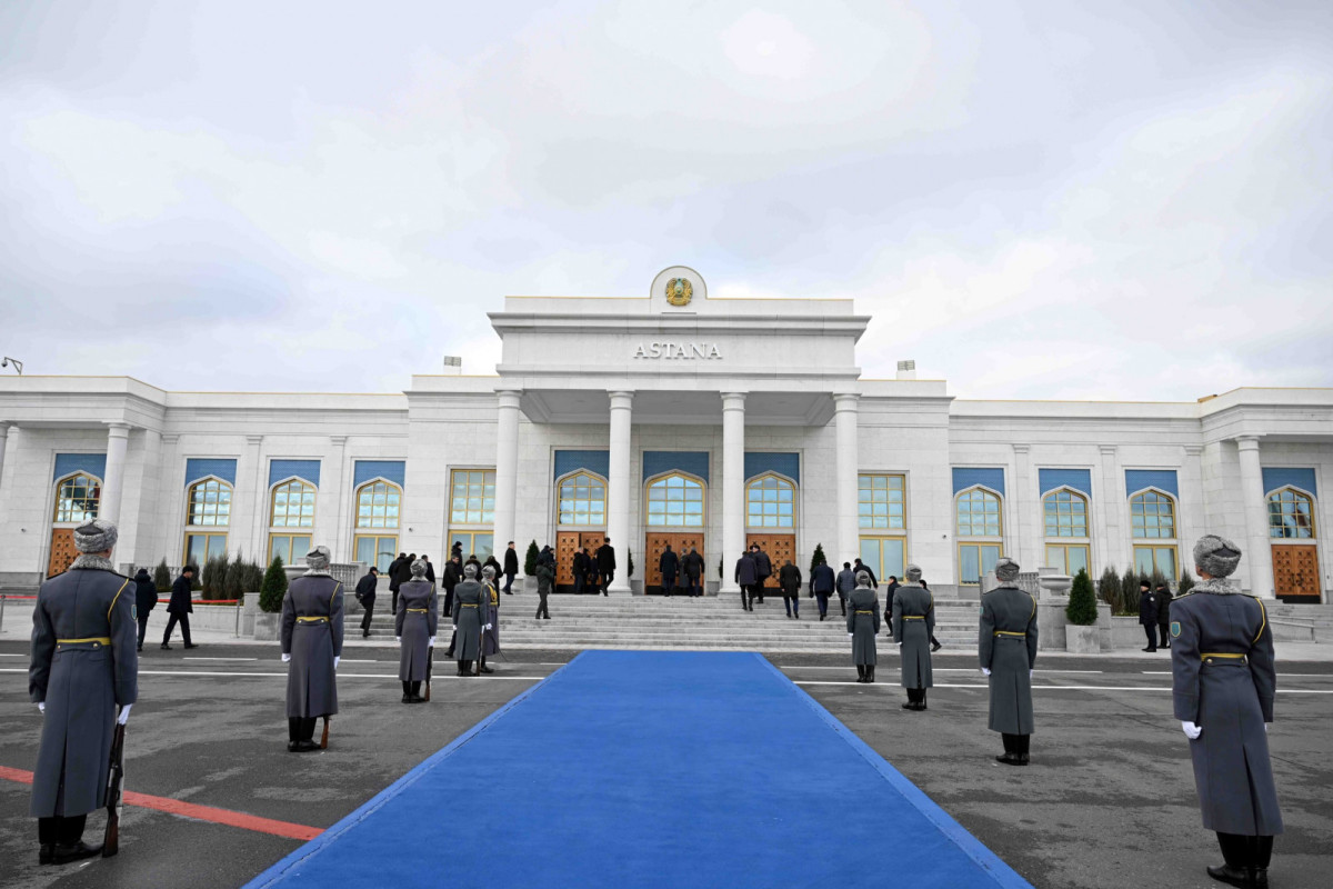 Аэропорттун флагштокторуна эки өлкөнүн мамлекеттик туулары илинип, ардактуу кароол тизилди.