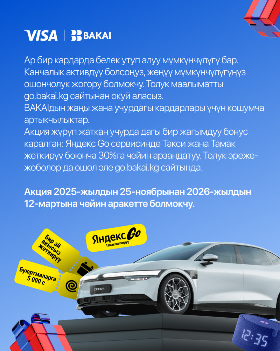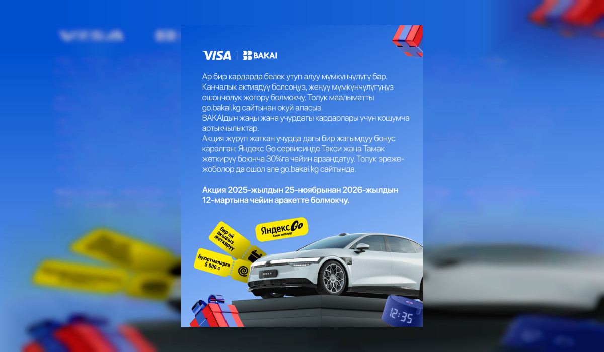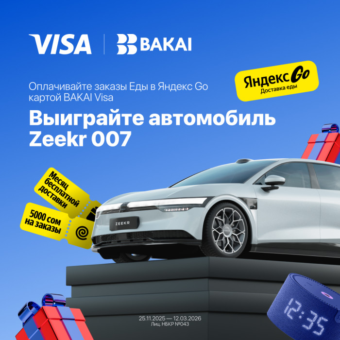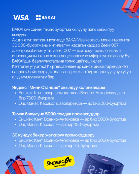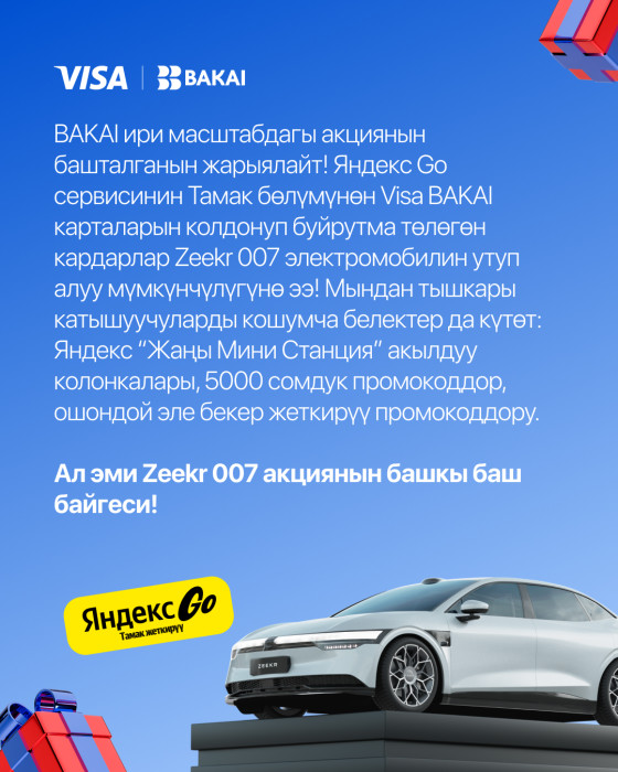 BAKAI ири масштабдагы акциянын башталганын жарыялайт! Яндекс Go сервисинин Тамак бөлүмүнөн Visa BAKAI карталарын колдонуп буйрутма төлөгөн кардарлар Zeekr 007 электромобилин утуп алуу мүмкүнчүлүгүнө ээ! Мындан тышкары катышуучуларды кошумча белектер да күтөт: Яндекс “Жаңы Мини Станция” акылдуу колонкалары, 5000 сомдук промокоддор, ошондой эле бекер жеткирүү промокоддору.