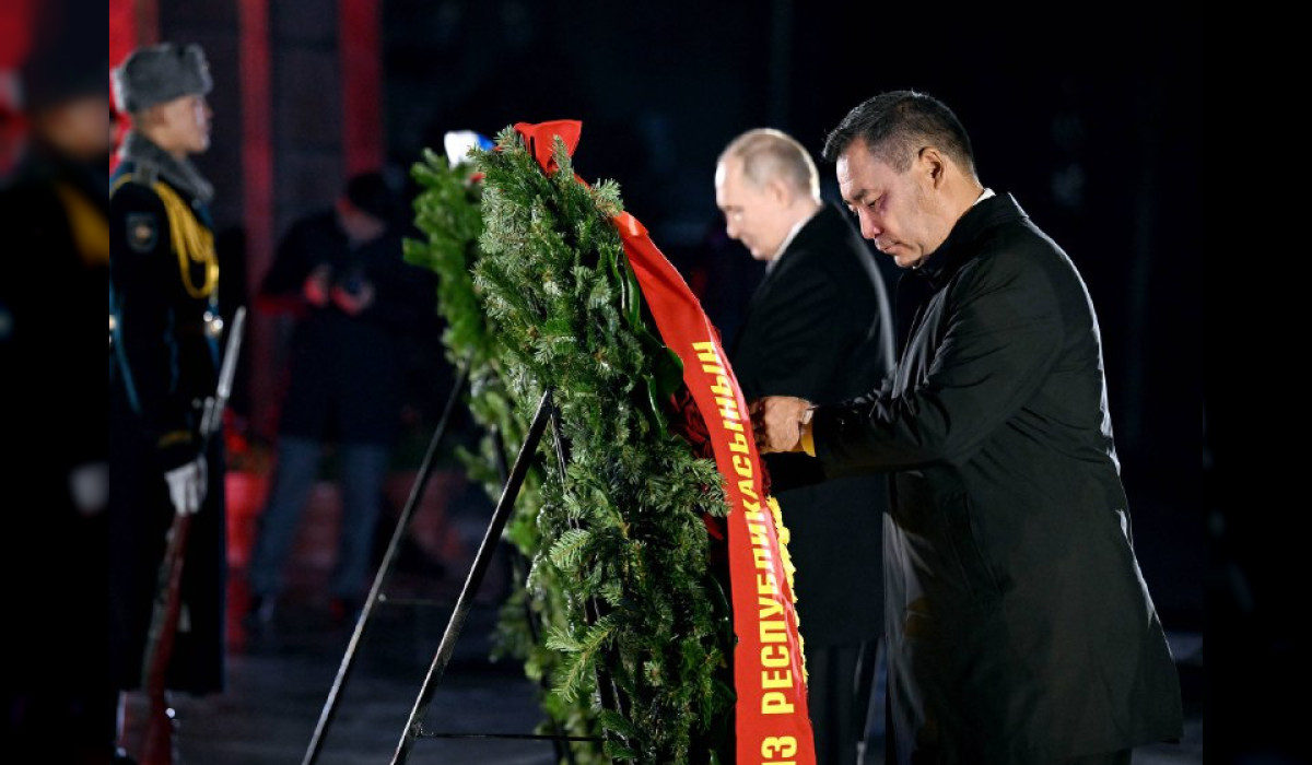 Президент Садыр Жапаров менен Орусиянын президенти Владимир Путин Бишкекте Жеңиш аянтындагы Өчпөс отко гүлчамбар коюшту.