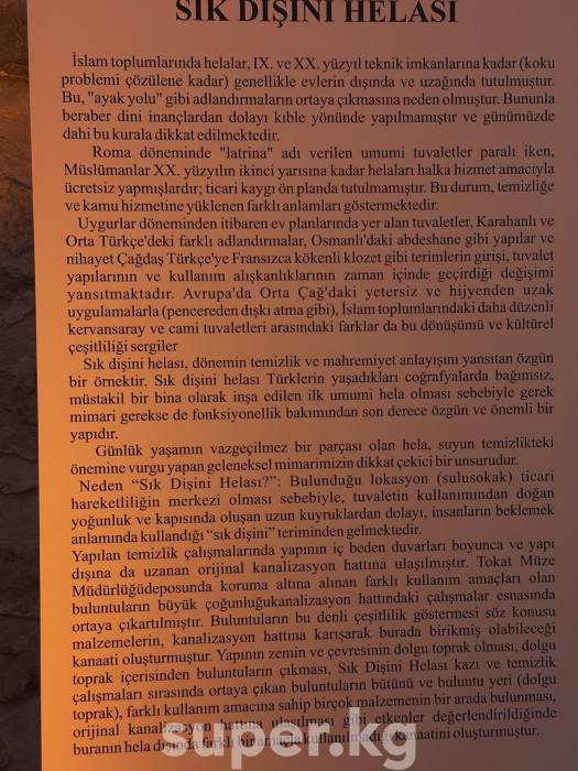 Токаттын эң кызыктуу өзгөчөлүктөрүнүн бири — ажаткана музейи болду. Бул жерде илгерки доордун адамдарынын тазалыкка болгон мамилеси, эски мончо системалары, тарыхый ажатканалардын формалары жана ошол доорлорго мүнөздүү турмуш буюмдары көрсөтүлгөн. Негизи Түркияда алгачкы канализация түшүнүгү Токатта пайда болгондугу айтылды. Жана да бул аймак өзүнүн хамамдары менен белгилүү. Кээ бир экспонаттар күлкүлүү жана таң калыштуу, бирок туристтерди өзүнө тартып турат.
