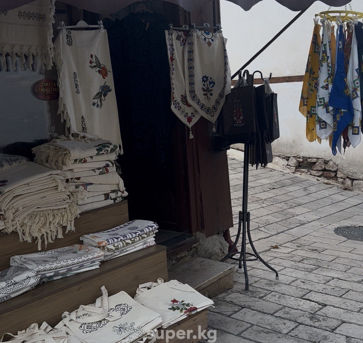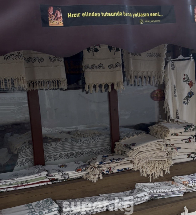 Тарыхый мурастарга көзүбүз тоюп чыккан соң тар көчөлөрдү бойлой басып бара жаттык. Эски үйлөр үч кабаттан ашпайт, анткени тарыхый зонаны жабып калышы мүмкүн. Бул туристтер үчүн баалоочу жана жеңил багыт алуу мүмкүнчүлүгүн түзөт. Биринчи кабатында жергиликтүү элге таандык буюмдар сатылат. Токат эли кол өнөрчүлүккө көп басым жасайт: кездеме бетине түрдүү сүрөттөрдү атайын жабдыктар менен түшүрүп, түркүн түскө боёп чыгышат. Мен да эстелик үчүн 200 лирага, биздин акча менен 414 сомго бир чоң жоолук сатып алдым.