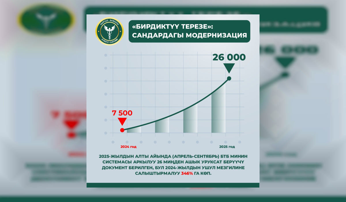 "Буга байланыштуу 2024-жылдын алты айында систем аркылуу 7,5 миңге жакын уруксат документтери берилсе, 2025-жылдын алты айында (апрель-сентябрь) 26 миңден ашык уруксат берүүчү документ берилген, бул 2024-жылдын ушул мезгилине салыштырмалуу 346 пайызга көп. Тейлеген ишкерлердин саны 34,8 пайызга, ал эми киреше бөлүгү 17 пайызга өстү",- деп айтылат билдирүүдө.