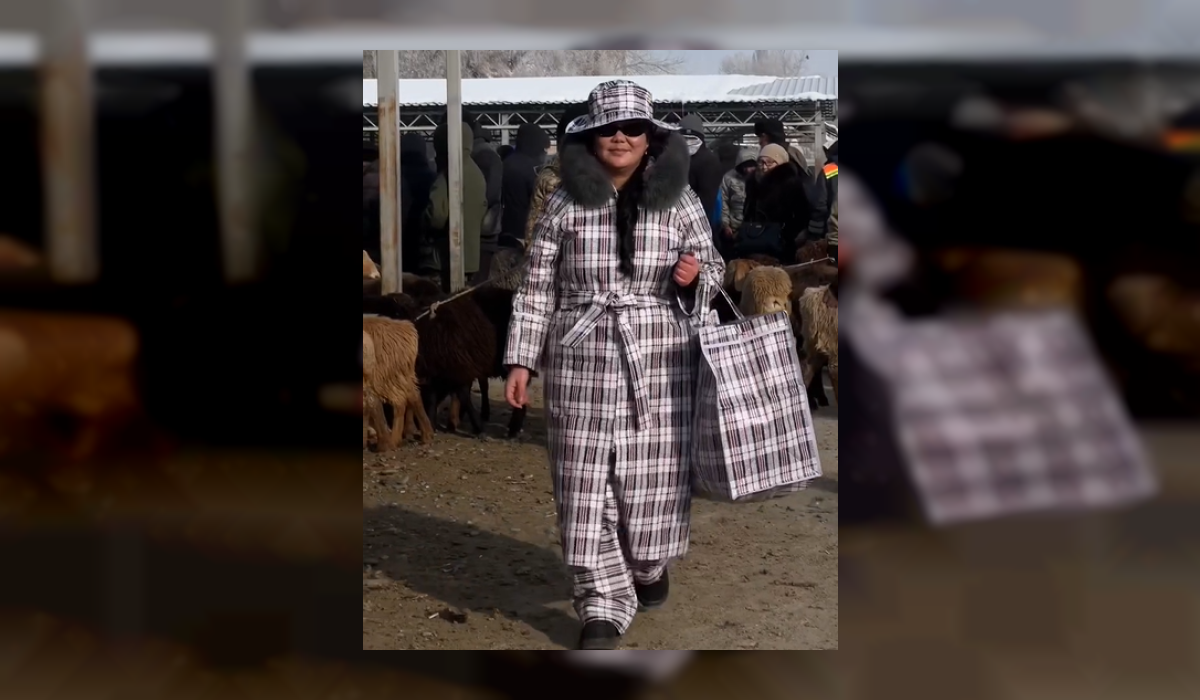 Кадимки ала баштыктан куртка, шым, шляпа кийип, дефиле уюштурган аялдын видеосу интернет желесине тарап жатат. Базарда басып, элдерге жакшы маанай тартуулаган айымдын бул кадамы талкуу жаратууда. Соодагерлер анын кийимин баалап, сүрөткө да түшүп жатышканын көрүүгө болот.