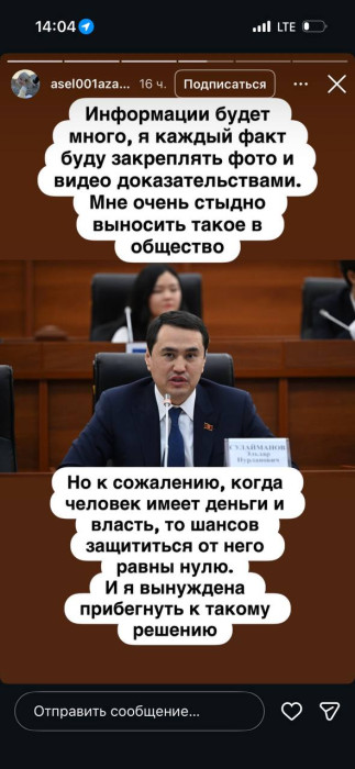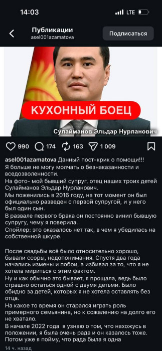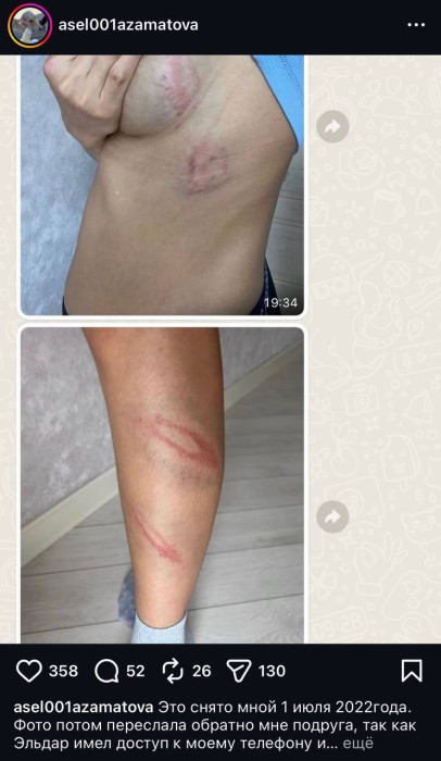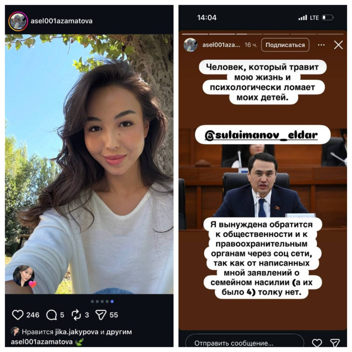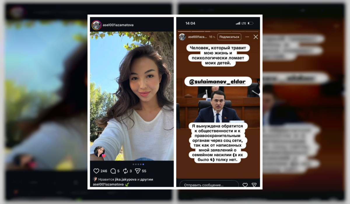 Жогорку Кеңештин депутаты Элдар Сулаймановдун мурунку жубайы жолдошу тарабынан зомбулук көрүп келе жатканын билдирип, социалдык тармактан айрым сүрөттөрүн жарыялады.
