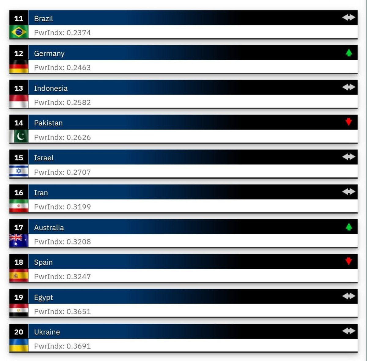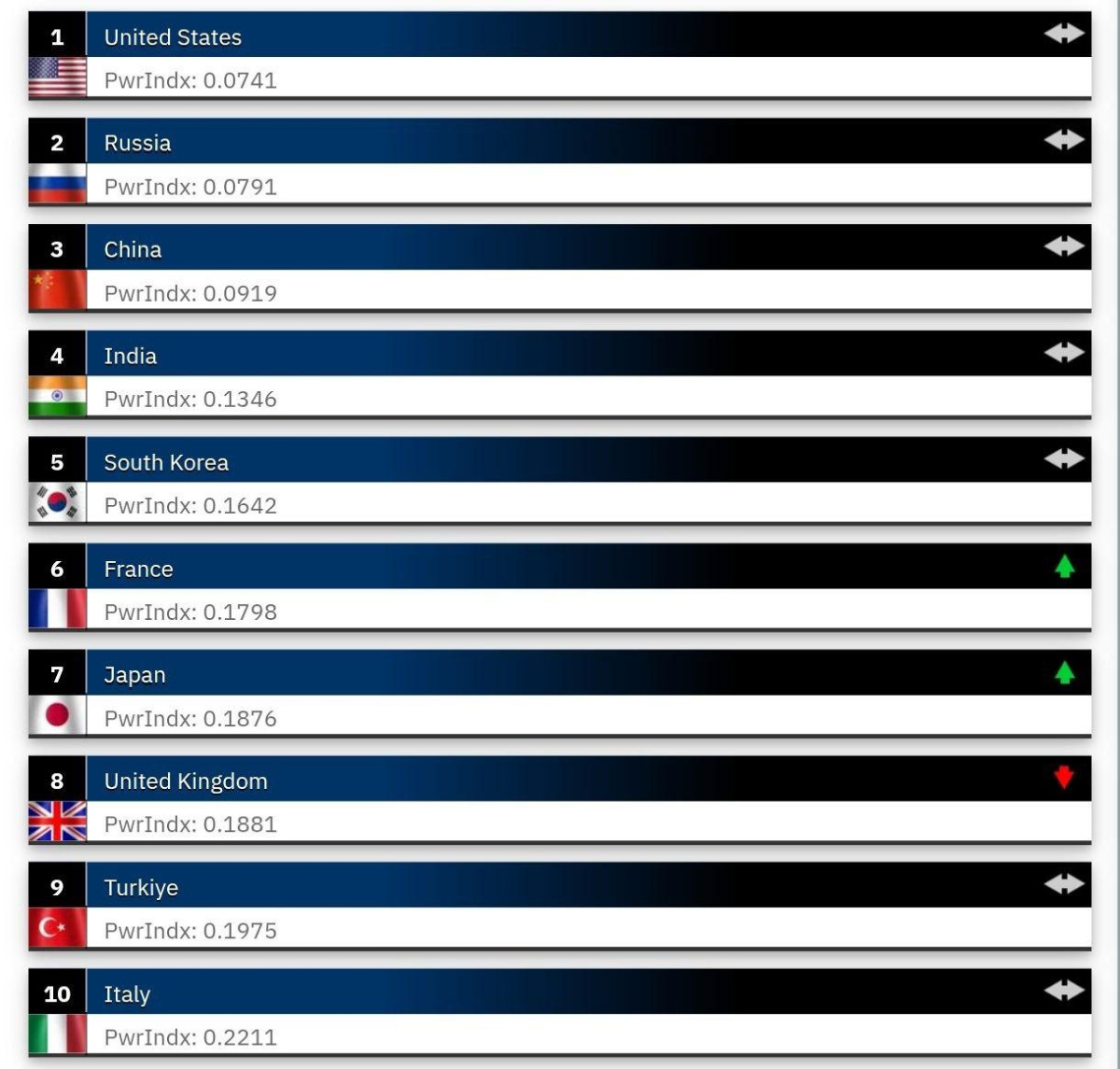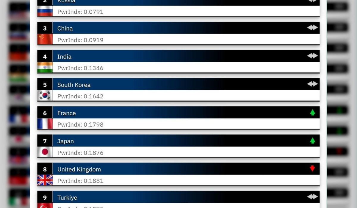 Алдыңкы үчтүккө АКШ, Орусия жана Кытай кирген. Ондукта Индия, Түштүк Корея, Франция, Япония, Улуу Британия, Түркия жана Италия бар.