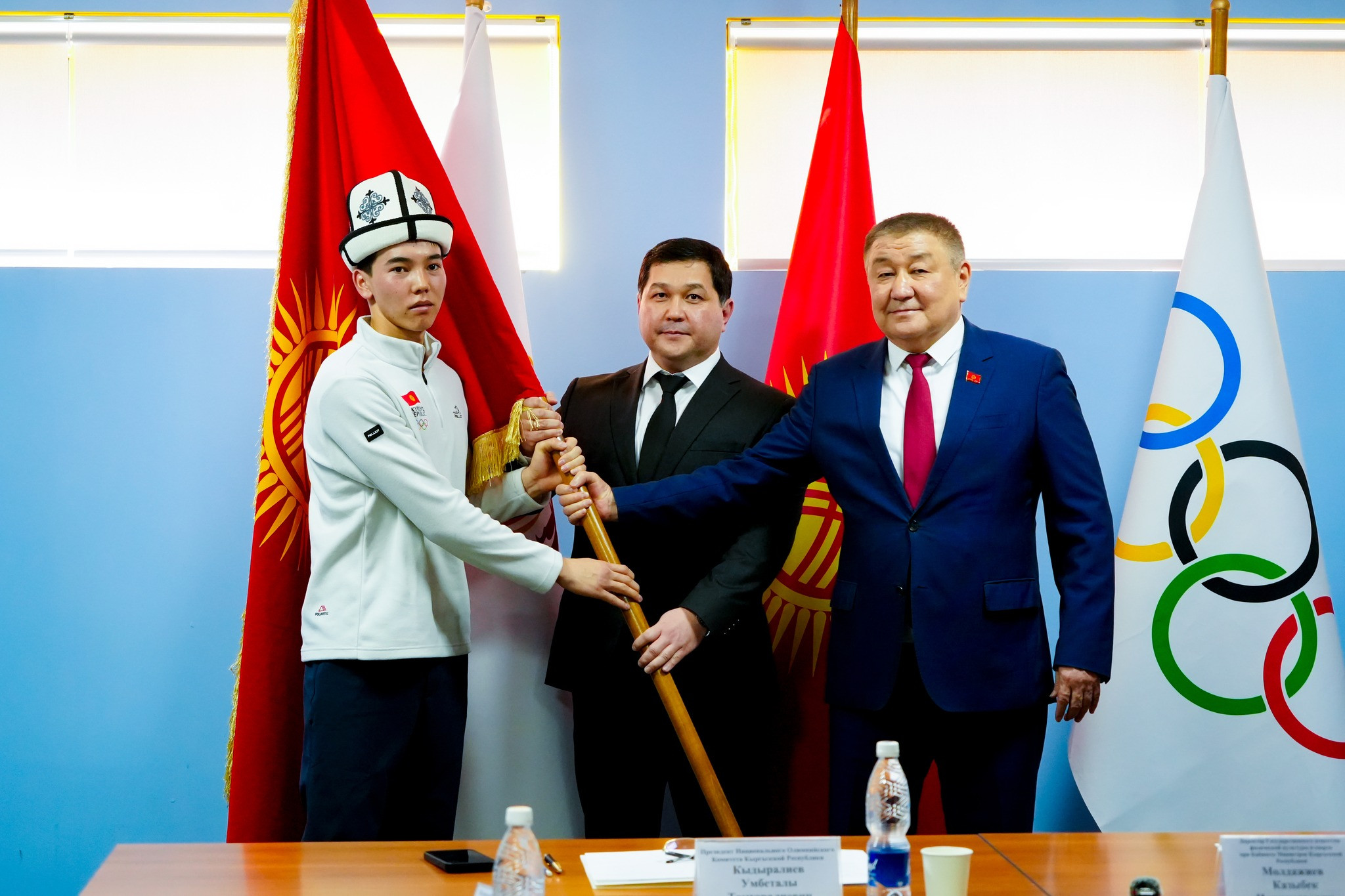 Ошондой эле иш-чаранын алкагында Казыбек Молдажиев лыжачы Артур Сапарбековго Кыргыз Республикасынын мамлекеттик туусун салтанаттуу түрдө тапшырды.