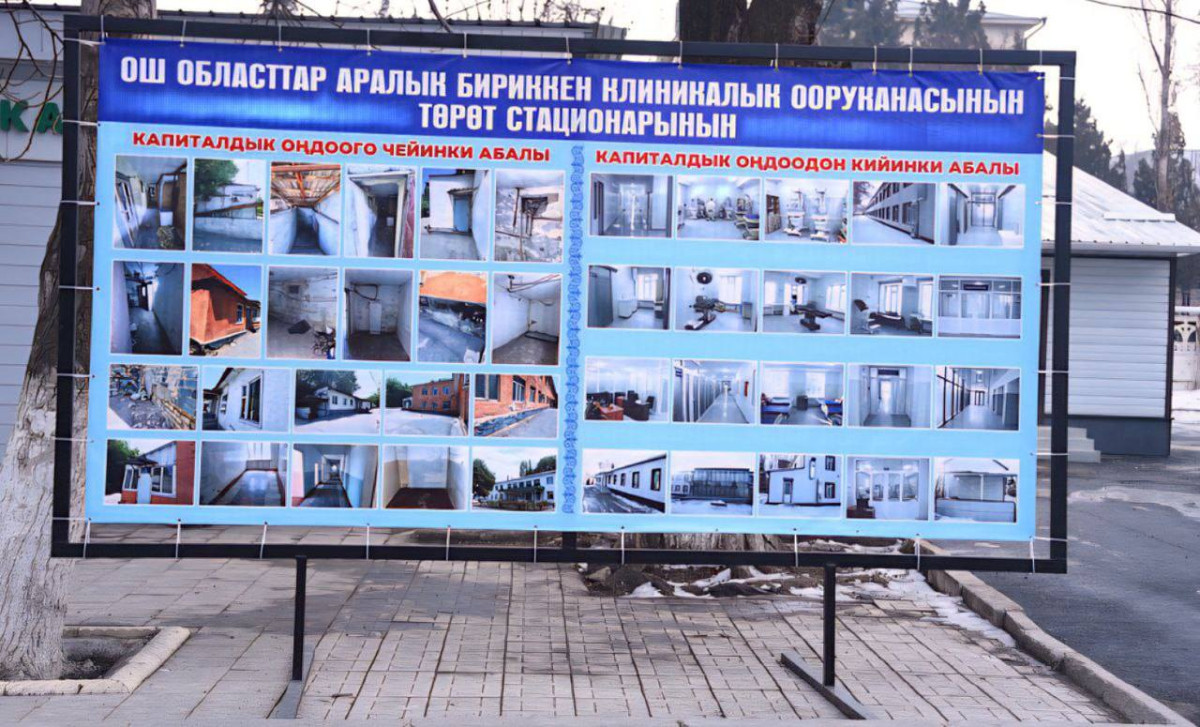 Берилген маалыматка ылайык, капиталдык оңдоо иштери төрөт стационарынын жандандыруу, эне менен баланын бирге болуу, ымыркайлардын жандандыруу, төрөт бөлүмү, кабыл алуу, кош бойлуу энелердин патологиясы,операциялык залдар, борбордук стерилизация, клиникалык лаборатория бөлүмдөрүн камтыды.