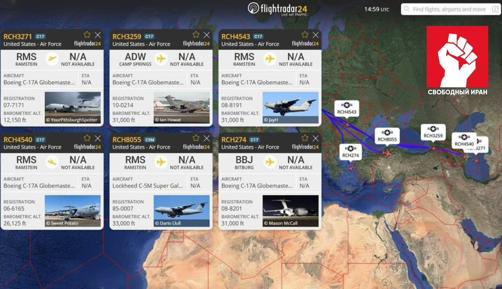 АКШнын аба күчтөрүнө таандык C-17A Globemaster III жана MC-130 Super Hercules аскердик учактары Түркмөнстандын белгисиз аймагына конду. Бул тууралуу 9-февралда "Эркин Иран" Телеграм-каналы "FlightRadar24" платформасына таянып жарыялады.