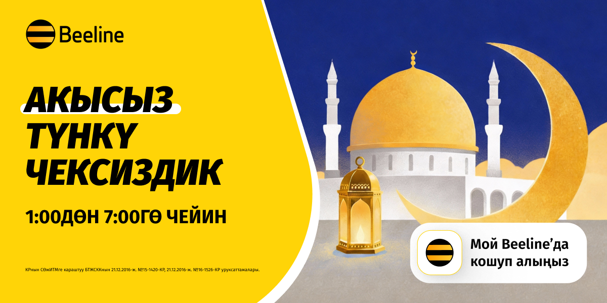 19-февралдан 21-мартка чейин Beeline абоненттери «Түнкү чексиздик» кызматын акысыз кошо алышат. Белекти «Мой Beeline» колдонмосунан активдештирип, түнкү саат 1:00дөн таңкы 7:00гө чейин ылдам интернетти чектөөсүз колдонуңуз. Кызматты колдонмодон кайра оңой эле өчүрүүгө болот.