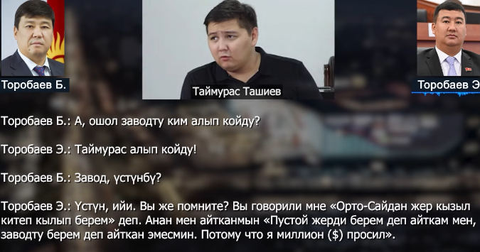 Анда Төрөбаев менен сүйлөшкөн адам УКМКнын мурдагы башчысы Камчыбек Ташиевдин уулу Таймурас заводду тартып алды деп айтканын угууга болот. Ал жер тилкесин эле сатканын белгилеп, заводду бузуп кетүү пландалганын кошумчалайт. Ошондой эле аудиожазууда саламаттык сактоо министри, мурдагы чекист Каныбек Досмамбетовдун да аты аталды. Министр менен сүйлөшкөн адам өзү АКШда жүргөнүн айтат.