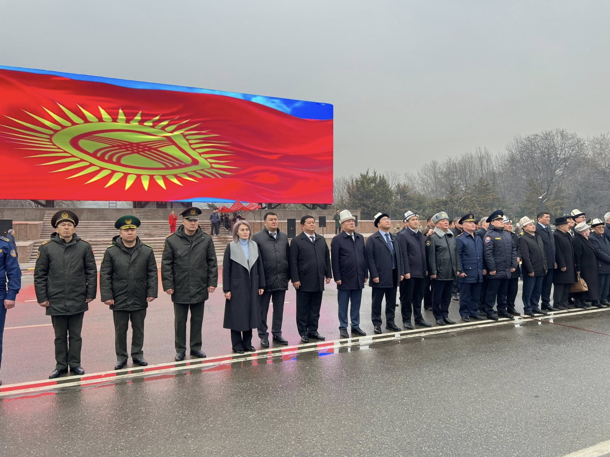 Иш-чаранын жүрүшүндө жоокерлер шаардын борбордук аянтына мамлекеттик тууну көтөрүштү.