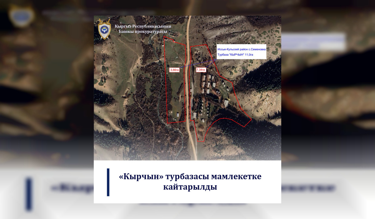 Ысык-Көлдүн Кырчын капчыгайында жайгашкан "Кырчын" туристтик базасынын мүлктүк комплекси 11 гектар жер тилкеси менен бирге мамлекетке кайтарылды. Бул тууралуу Башкы прокуратура билдирди.
