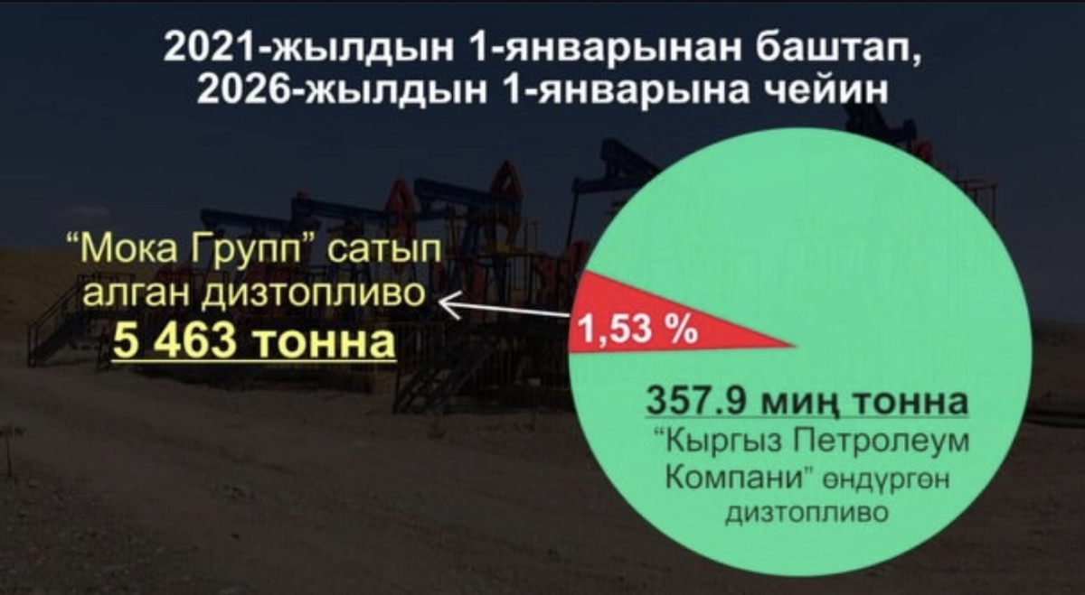 Ал белгилегендей, "Мока Групп" компаниясы 2021-2025-жылдары “Кыргыз Петролеум Компани” өндүргөн дизель отунун өтө аз бөлүгүн гана сатып алган – жалпы өндүрүштүн 1,53 пайызы гана. Сатып алуулардан тиешелүү салыктар мамлекетке төлөнгөндүгүн жазды.