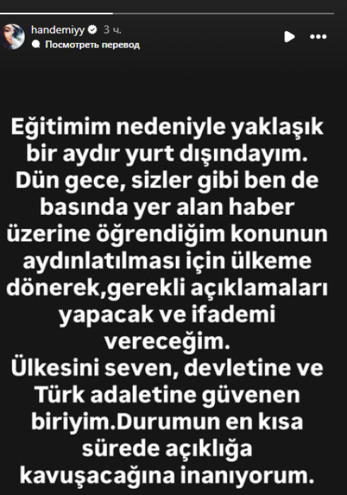 Түрк сериалдарындагы эң популярдуу актрисалардын бири Ханде Эрчел Стамбул шаардык прокуратурасынын аны камакка алуу буйругу боюнча билдирүү жасады. Бул тууралуу актриса айым өзүнүн социалдык тармактагы баракчасына жазды.