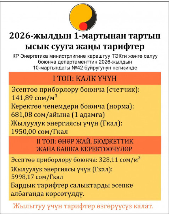 Бишкек жылуулук тармагы муниципалдык ишканасы билдиргендей, Энергетика министрлигине караштуу Отун-энергетикалык комплексти жөнгө салуу департаментинин 2026-жылдын 10-мартындагы №42 буйругуна ылайык ысык сууга жаңы тариф бекитилди.