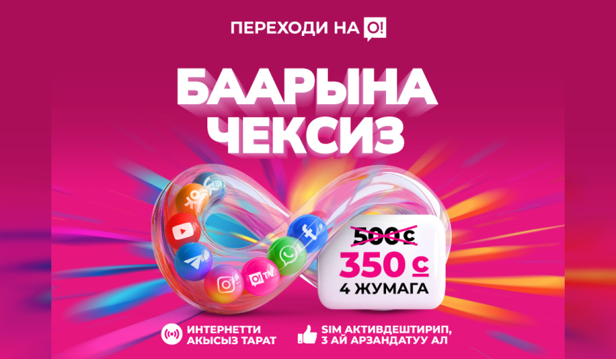 Алкаксыз жана компромисссиз лимитсиздикти тандаңыз – «Баарына чексиз 500» тарифин акция боюнча болгону 350 сомго кошуңуз. Сиз толук лимитсиздикке ээ болосуз – сервистерге бөлүнбөстөн, «тандалган» тиркемелерсиз жана татаал шарттарсыз.