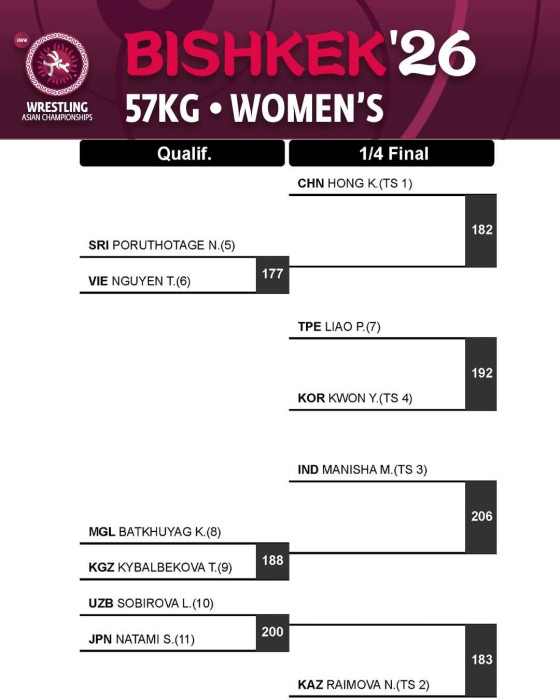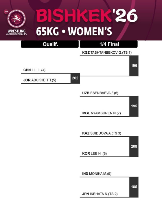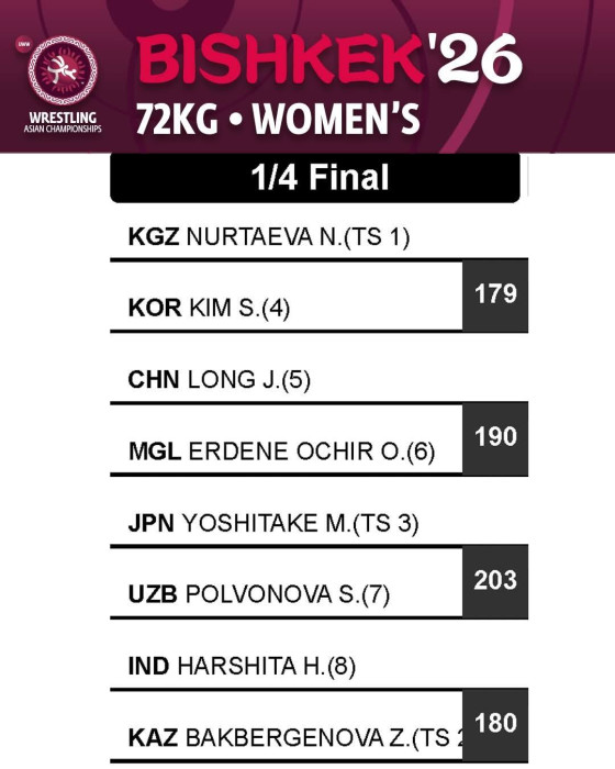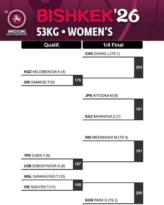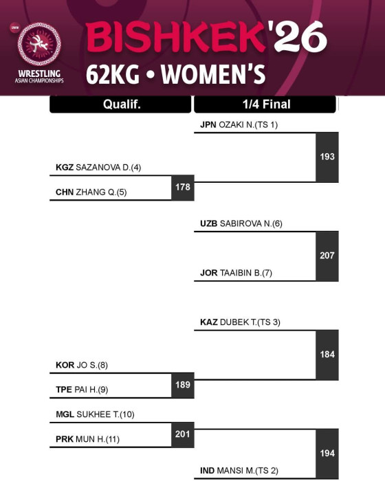 Бишкекте спорттук күрөш боюнча Азия чемпиондугу уланууда. Бүгүн, 9-апрелде килемге кыз-келиндер күрөшүнүн өкүлдөрү чыгып, 53, 57, 62, 65 жана 72 килограмм салмак категорияларында байге орундары үчүн күч сынашат.