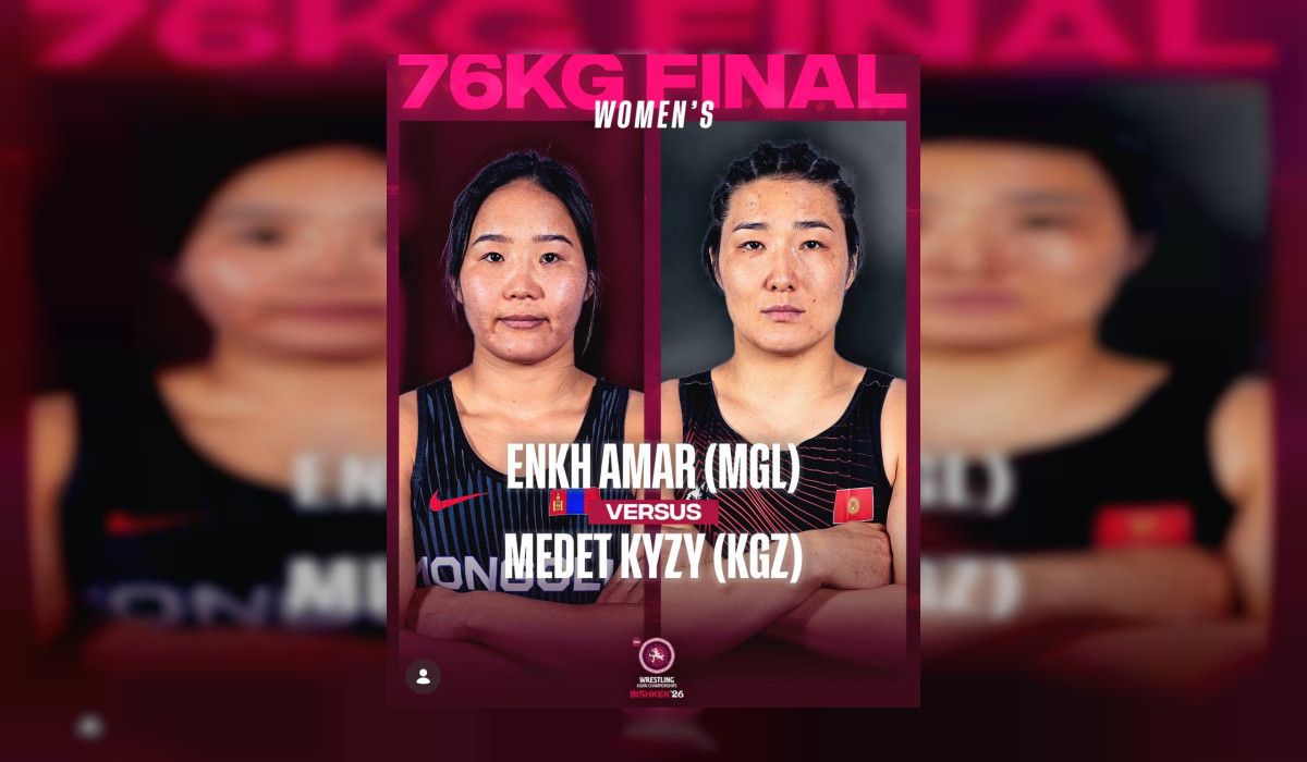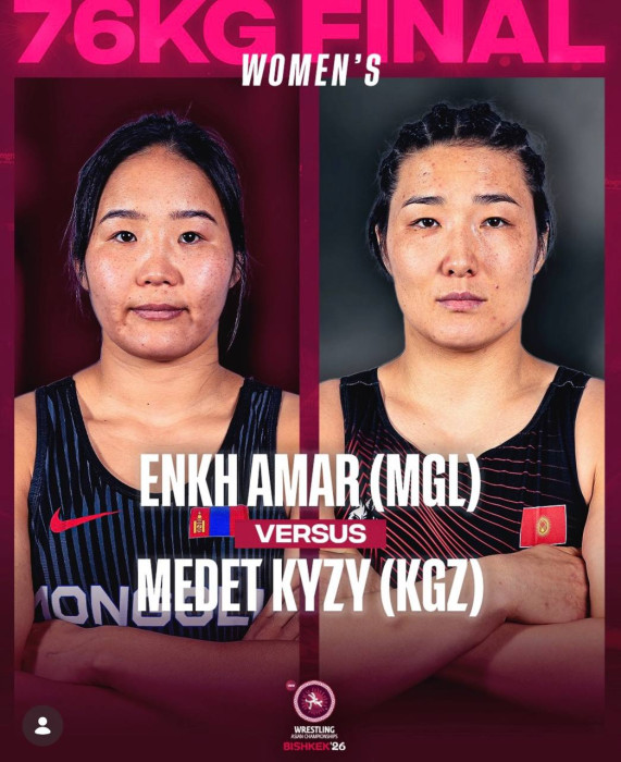 Кыргыздын балбан кызы 76 килограмм салмакта күч сынашууда. Анын атаандашы Монголиядан чыккан белгилүү балбан Даваанасан Энкх Амар.