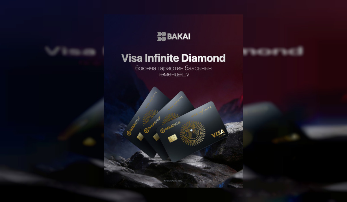 BAKAI премиалдык Visa Infinite Diamond картасын чыгаруу акысын төмөндөтүп жатканын жарыялайт. Муну менен банктын эң жогорку деңгээлдеги продуктуларынын бири кардарлар үчүн мурдагыдан да жеткиликтүү болууда. Ошол эле учурда жылдык тейлөө шарттары өзгөрүүсүз калат - карта ээлери үчүн кызмат көрсөтүүнүн жогорку деңгээли жана бардык артыкчылыктар сакталат.