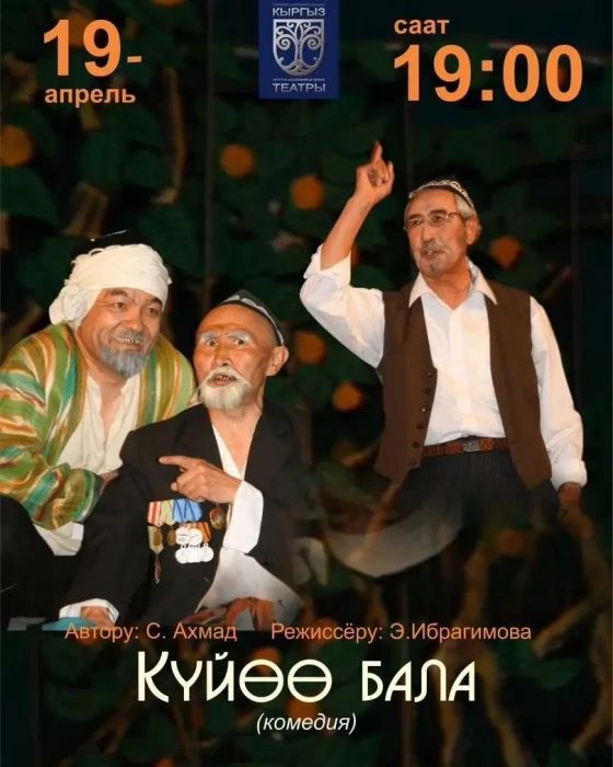 * "Күйөө бала" (комедия) спектакли - Кыргыз улуттук академиялык Токтоболот Абдумомунов атындагы драма театры. Башталышы: саат 19:00. Билет баасы 500 сом.