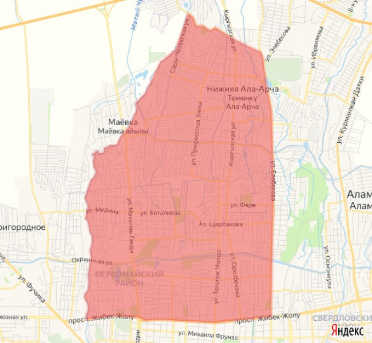 Өчүрүү төмөнкү аймактарды камтыйт: Күрөңкеев, Абдрахманов, Элебесов, Бельская көчөлөрү, Ала-Арча дарыясы, Жибек Жолу проспектиси, Жаш Гвардия бульвары, ЧЧК жана Саадаев көчөлөрү.